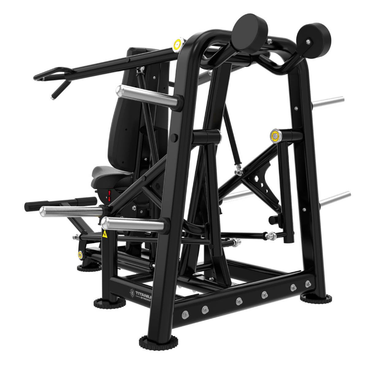 Le dossier bénéficie d’un réglage horizontal assisté par vérin à gaz, garantissant un alignement optimal. L’assise, réglable sur 13 niveaux, s’adapte à la taille de chaque utilisateur, positionnant correctement les épaules par rapport à l’axe de rotation des bras de levier. La pédale de pré-étirement réduit encore la contrainte initiale sur les articulations, rendant le début de chaque série plus confortable et sûr.